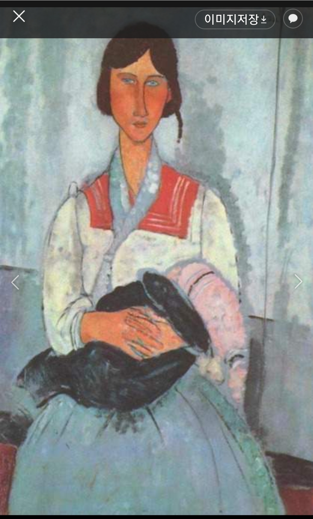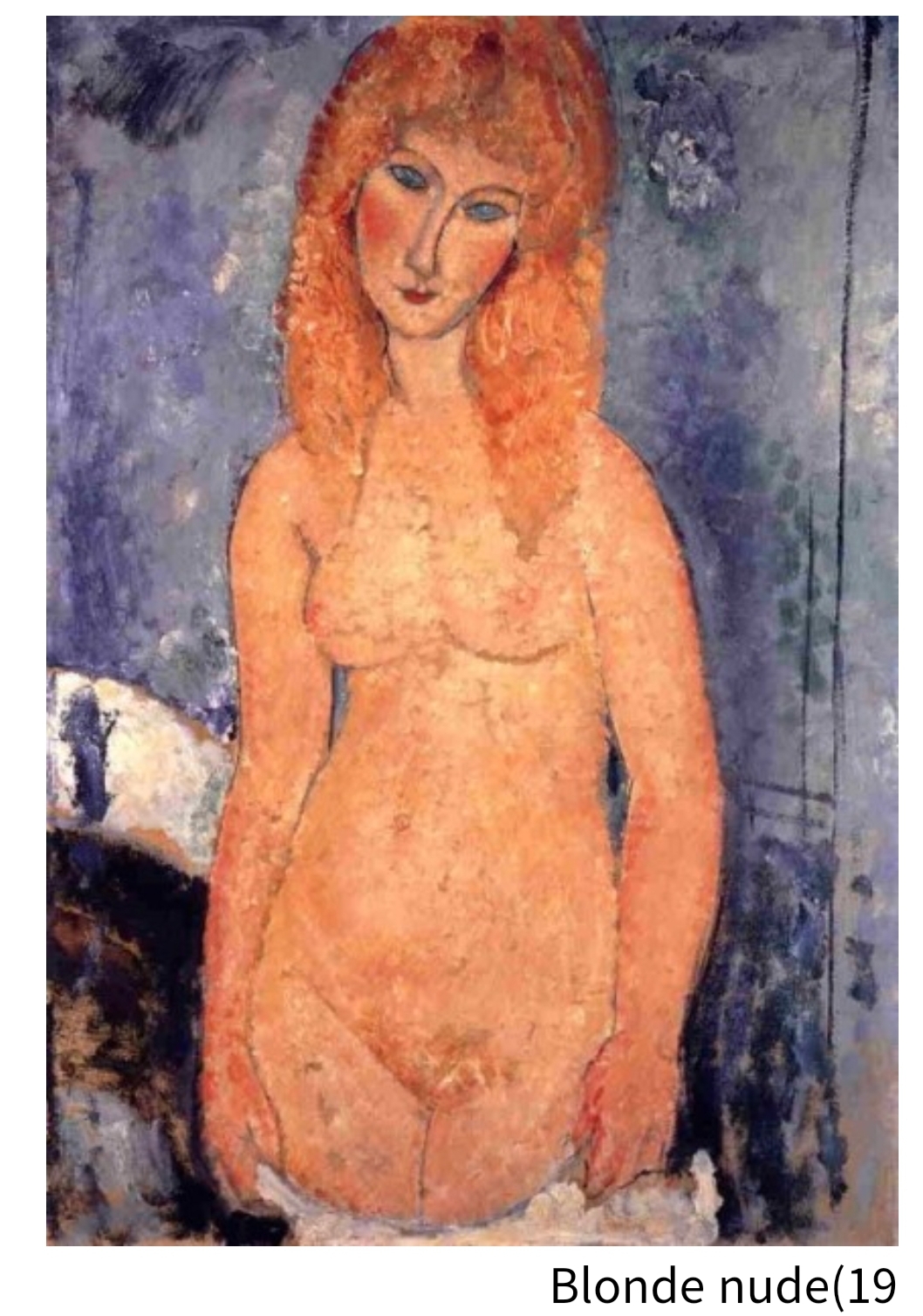 모델이 누구인가를 막론하고 모딜리아니의 그림에는 늘 애수 어린 분위기가 배어 있다. 이 누드 역시 마찬가지다. 옆으로 고개를 기울인 채 눈을 감고 있는 모델의 표정에서 일말의 슬픔이 느껴진다. 이 애수 어린 느낌은 화가의 독특한 개성으로도, 또 모던한 감각으로도 해석된다.
