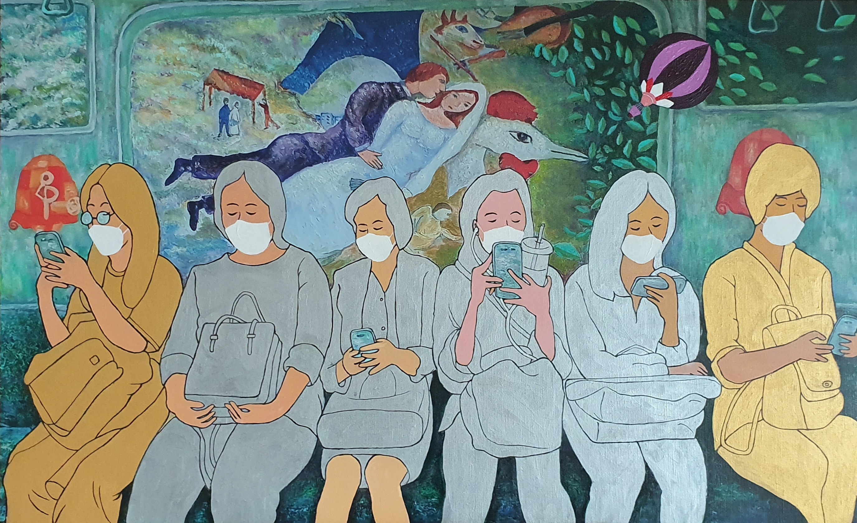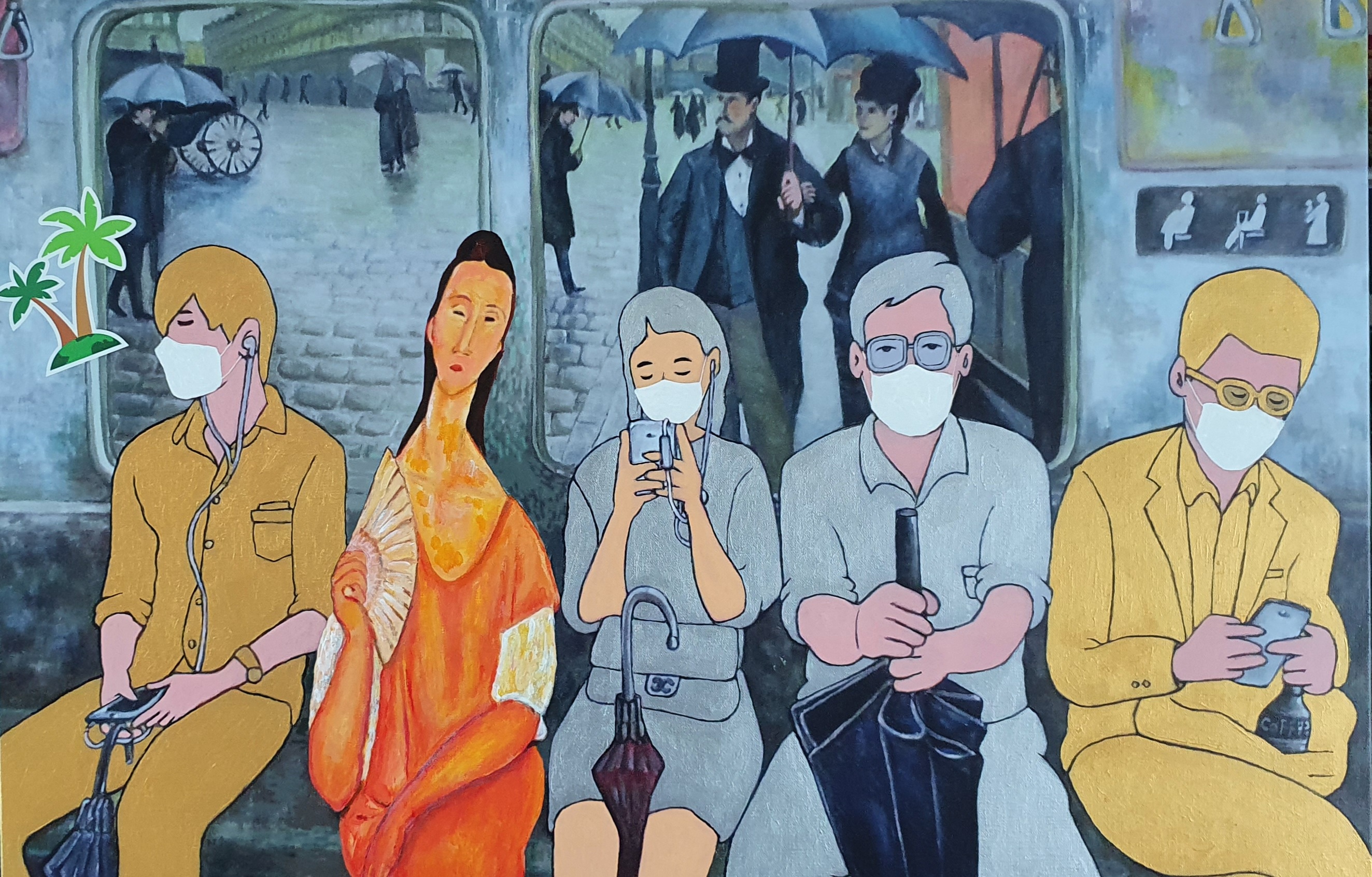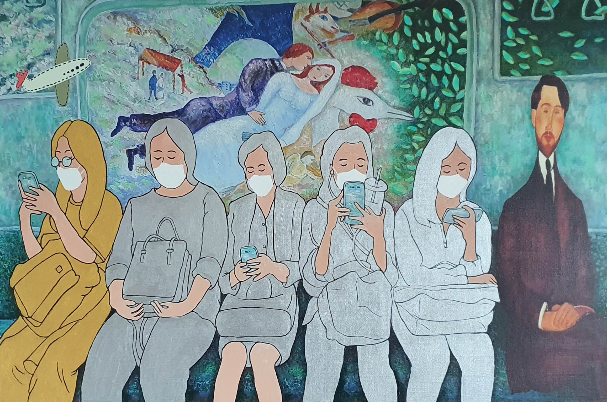 새 유화 작품들과 함께 컴퓨터 작업과 디지털 프린팅을 이용한 작품들이 유화 작품들이 선보인다. 지난 시리즈의 유화작품들을 디지털 프린팅으로 캔버스 위에 프린팅 하였다. 그리고 코로나19 시대를 겪는 2020년의 모습으로 재현하기 위해 등장인물들에게 마스크를 씌우고 피카소, 모딜리아니 등 명화 속 친숙한 인물들을 나란히 어우러지게 그려 넣었다. 승객들 틈에 명화 속 인물들이 함께 앉아 있음으로 해서 "낯설게 하기" 기법의 새로운 시각과 신선미 효과를 높였다. 색조의 효과를 위해 승객과 배경 등 전면적으로 아크릴 물감 작업을 가미했다. 그리고 마지막 레이어 작업으로 스마트폰을 통과하며 화보 편집용 이모지(이모티콘)를 그림 위에 덧붙임으로써, 코로나19 전쟁 시국의 극복을 기원하는 마음으로 친숙하고 위트 있는 스마트폰 중심 문화생활로 화면 분위기 전환을 시도해 보았다.