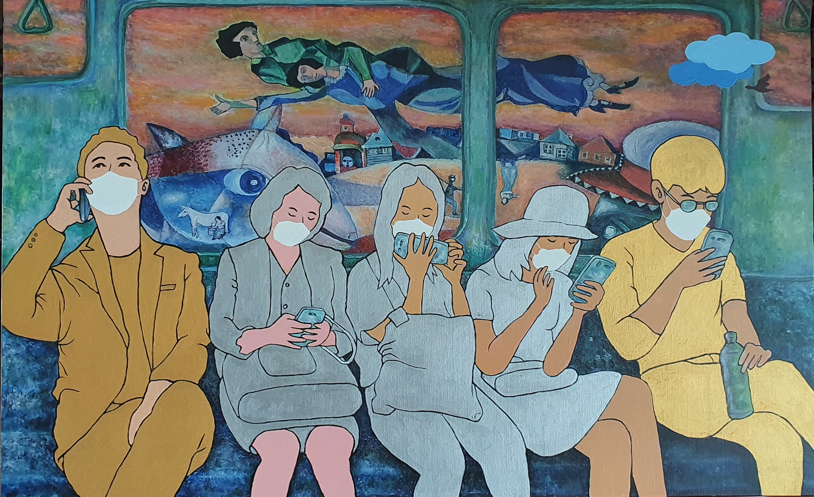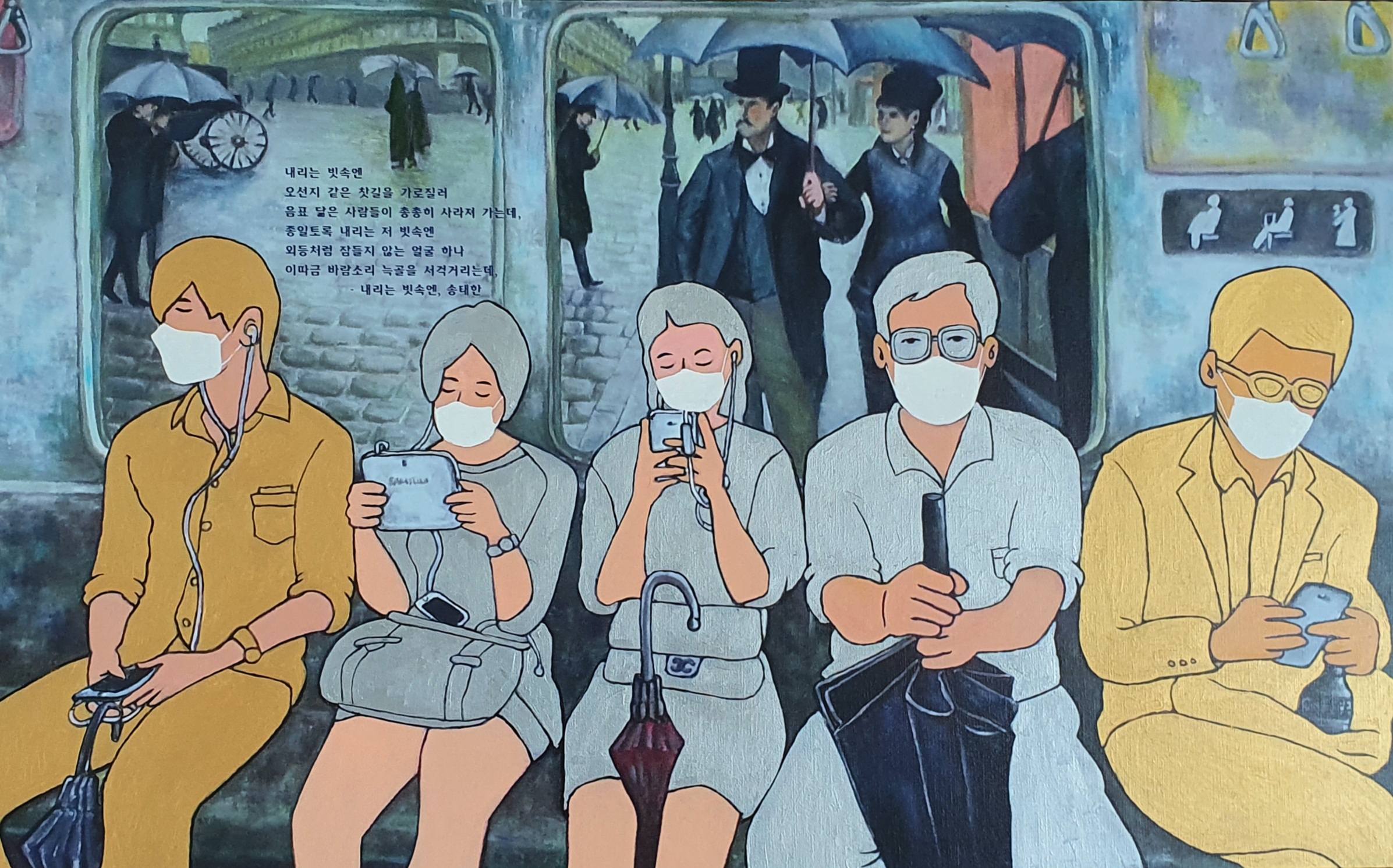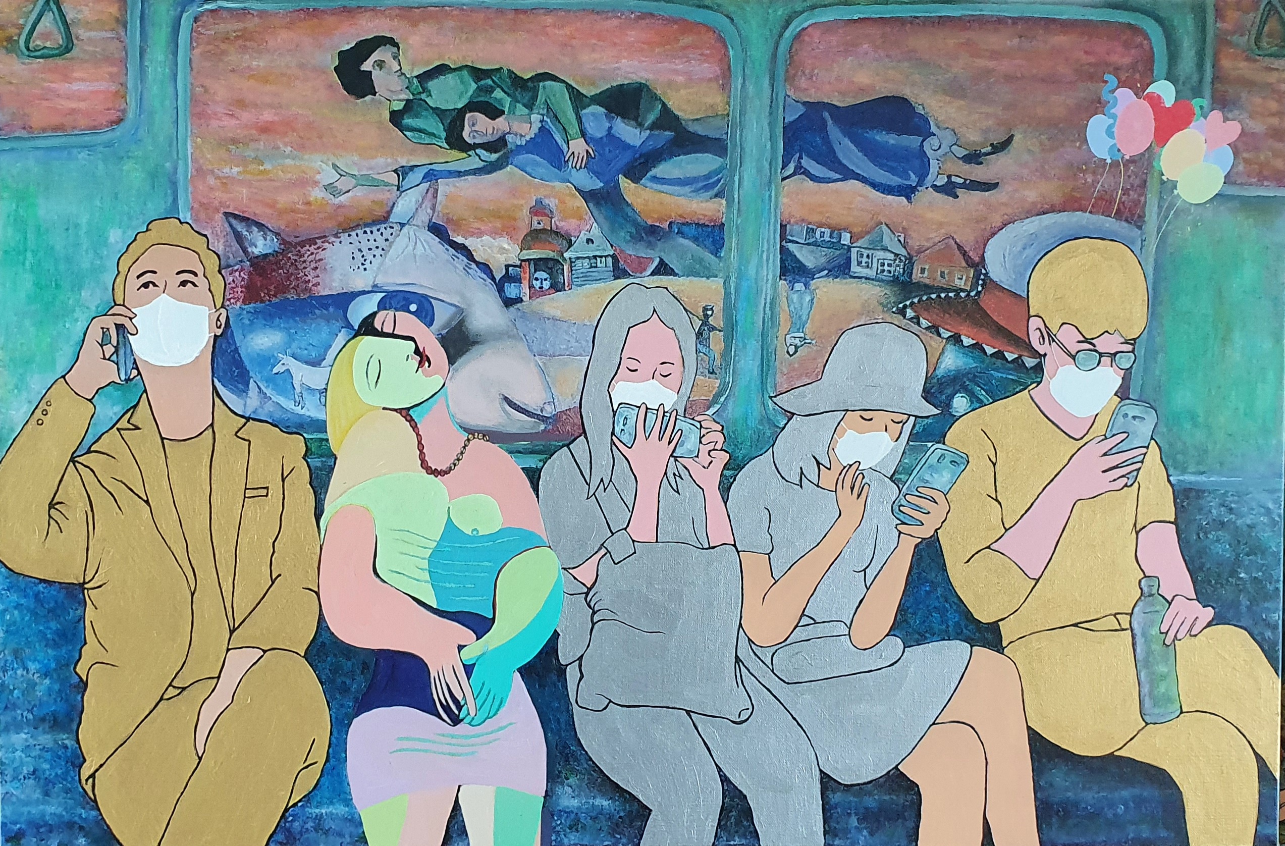 새 유화 작품들과 함께 컴퓨터 작업과 디지털 프린팅을 이용한 작품들이 유화 작품들이 선보인다. 지난 시리즈의 유화작품들을 디지털 프린팅으로 캔버스 위에 프린팅 하였다. 그리고 코로나19 시대를 겪는 2020년의 모습으로 재현하기 위해 등장인물들에게 마스크를 씌우고 피카소, 모딜리아니 등 명화 속 친숙한 인물들을 나란히 어우러지게 그려 넣었다. 승객들 틈에 명화 속 인물들이 함께 앉아 있음으로 해서 "낯설게 하기" 기법의 새로운 시각과 신선미 효과를 높였다. 색조의 효과를 위해 승객과 배경 등 전면적으로 아크릴 물감 작업을 가미했다. 그리고 마지막 레이어 작업으로 스마트폰을 통과하며 화보 편집용 이모지(이모티콘)를 그림 위에 덧붙임으로써, 코로나19 전쟁 시국의 극복을 기원하는 마음으로 친숙하고 위트 있는 스마트폰 중심 문화생활로 화면 분위기 전환을 시도해 보았다.