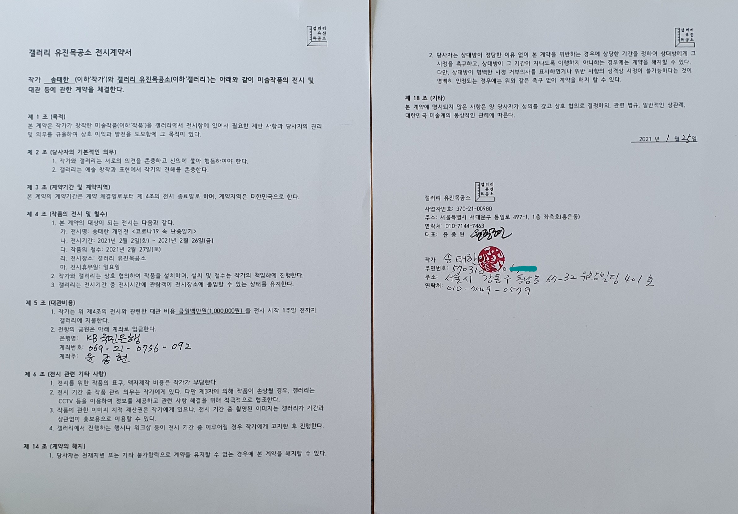 유진갤러리 전시 계약서(참조)
