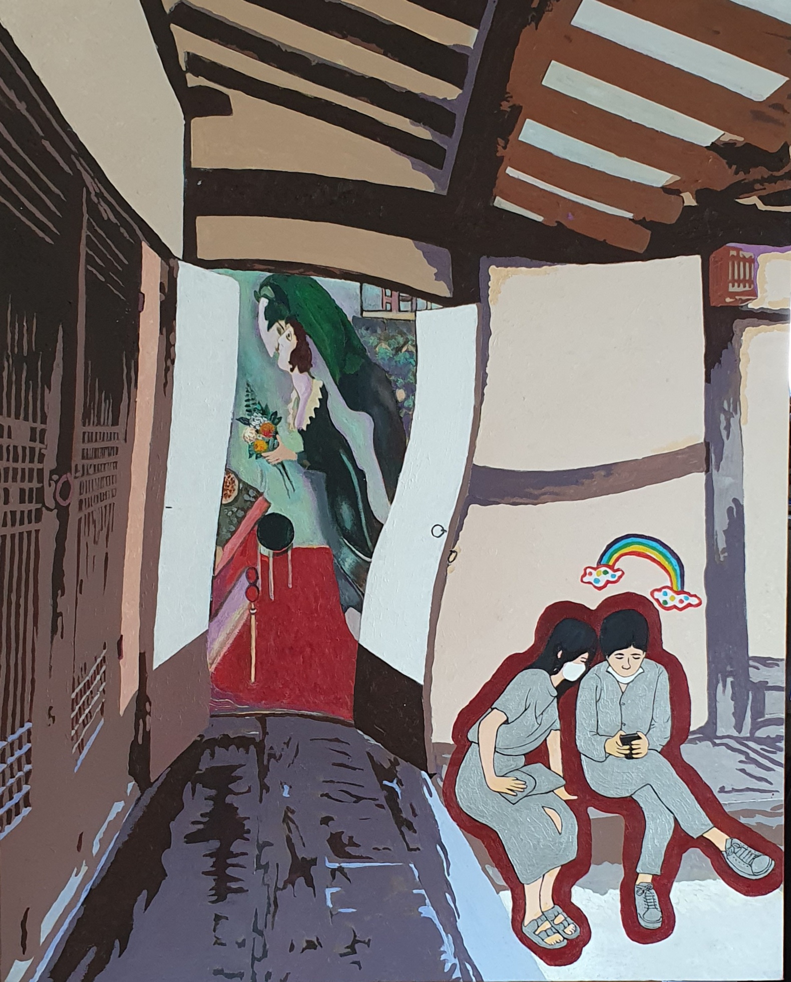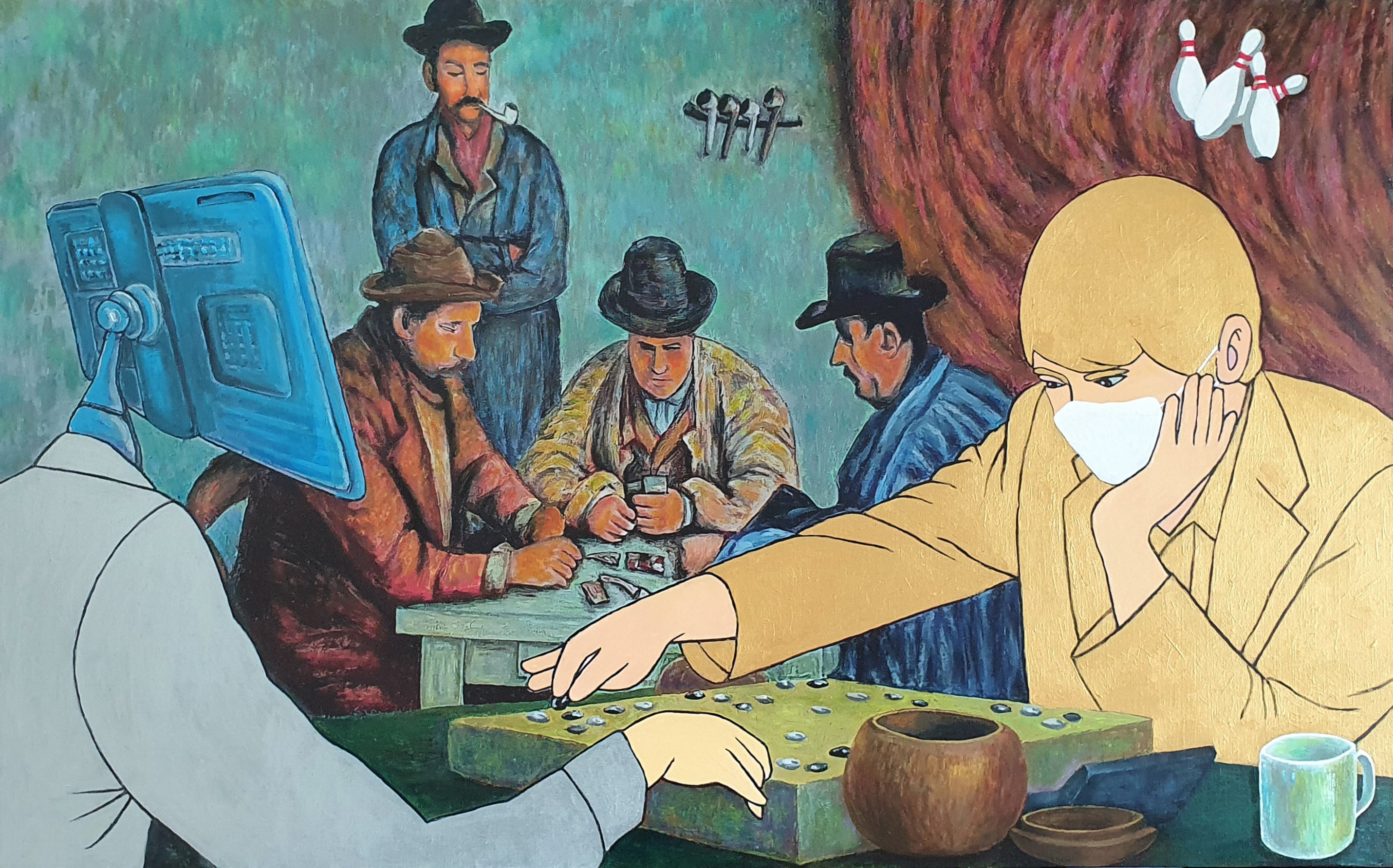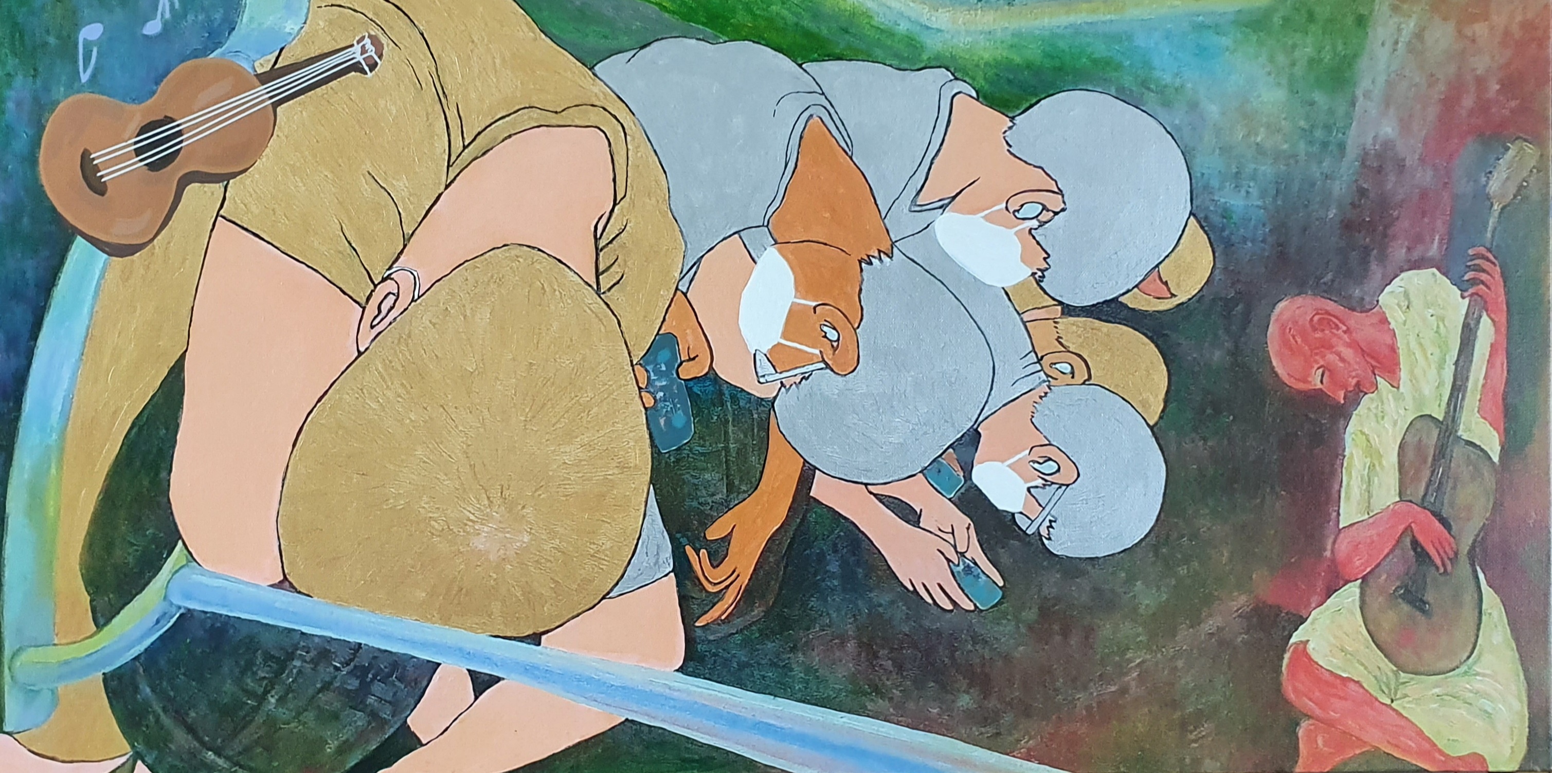 2020년 초부터 코로나19를 겪고 있는 세계인의 모습을 위대한 예술가들을 오마주하며 패러디 기법을 활용하여 표현하였다. 문화생활과 일상생활을 손에 쥔 스마트폰을 통해 해결하는 현대인의 모습과 명화를 하나의 화폭에 어우러지게 녹여냈다.
