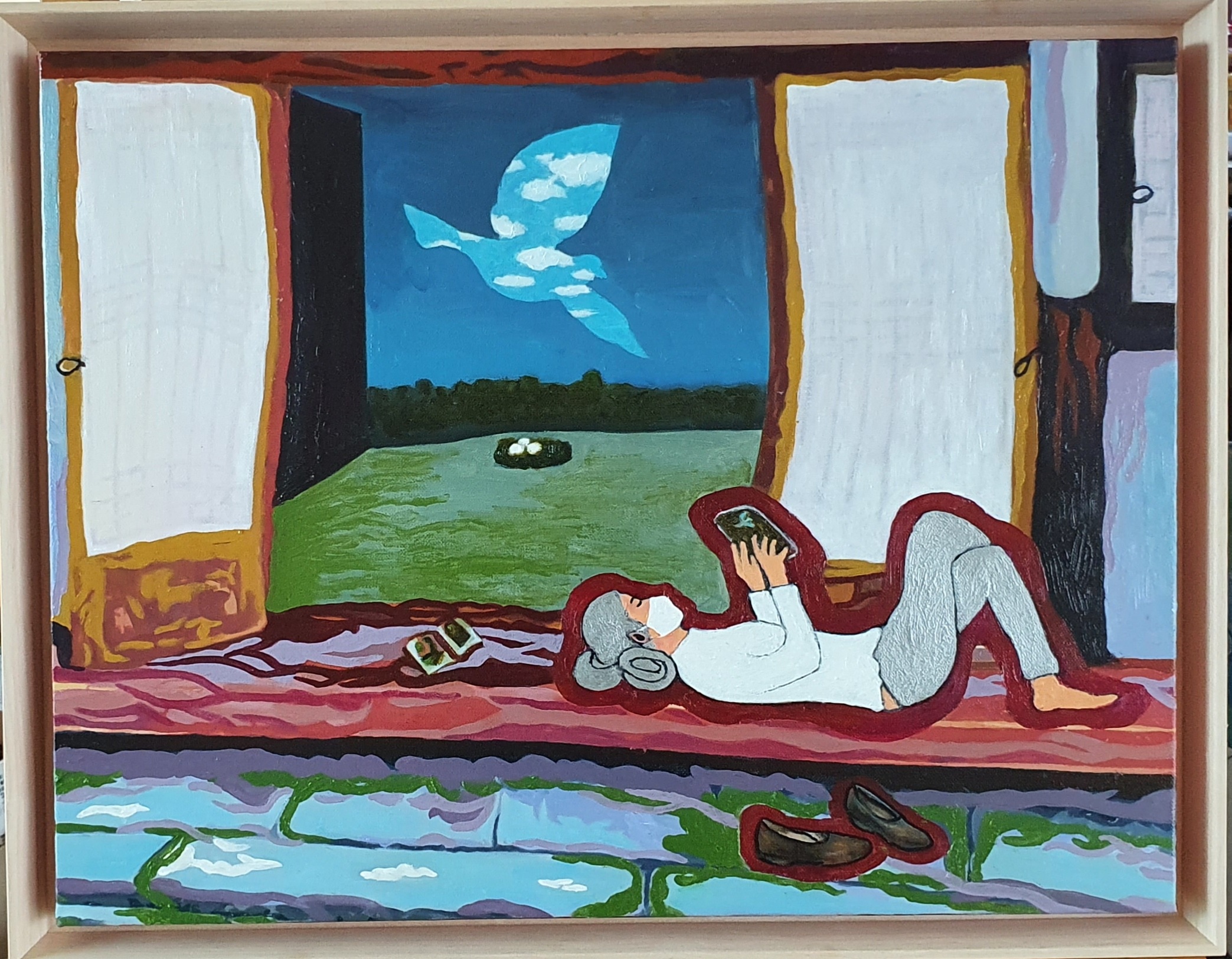 코로나19 바이러스는 비대면 생활을 촉진하여 인터넷 생활, 스마트폰 이용 빈도를 더 크게 하였다. 마스크를 착용하는 일이 습관이 되었지만 아이러니하게도 불확실한 미래로 가기보다는 어서 빨리 마스크 쓰기 전의 과거로 되돌아 가고픈 간절한 마음이다. 소중한 공기의 고마움을 이제 배우고 있다. 물과 공기 등 자연 환경 파괴를 앞장섰던 인간들에게 보내는 자연의 경고라고 해석한다. 전염병의 습격을 피해 하얀 마스크를 착용하였지만 대다수 사람들은 여전히 스마트폰을 들고 인터넷 서핑을 하고 있다. (어쩌면 세상의 종말이 오더라도 스마트폰을 사용하고 있으리라.) 개개인 모두가 손안에 스마트폰을 쥐고서 손끝에서 글로벌 문화를 향유하며 마그리트 그림 속 비상하는 새의 꿈처럼 여전히 사람들은 사회생활과 문화생활, 세계와의 소통을 계속하고 있다.