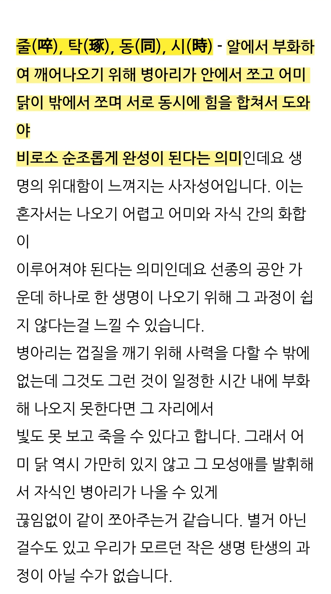 그러면 알을 품던 어미닭이 소리를 알아듣고 동시에 밖에서 알을 쪼아 안팎에서 서로 쪼아댄다.