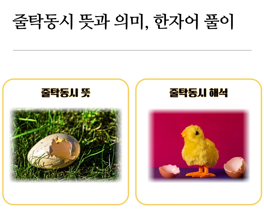 “줄탁동시(啐啄同時)”는 『벽암록』 제16측에 나오는 공안의 하나입니다. 따라서 주로 선종에서 많이 인용되고 있는 말입니다. 그 내용인즉, 닭이 알을 품었다가 달이 차면 알속의 병아리가 안에서 껍질을 쪼는 것을 “줄(啐)”이라 하고, 그 반대로 어미 닭이 그 소리를 듣고, 밖에서 마주 쪼아 껍질을 깨뜨려 주는 것을 “탁(啄)”이라고 합니다.
